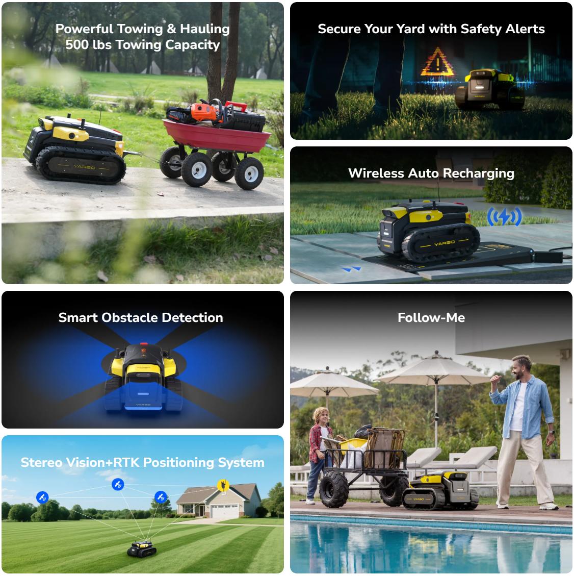 Yes! The Yarbo Core comes with a smart assist module that not only supports towing but also includes advanced surveillance capabilities with real-time video streaming via its binocular front camera and side cameras. This makes the Yarbo Core a versatile, multi-functional robot that can follow you while carrying heavy loads, and double as a security robot to protect your property.