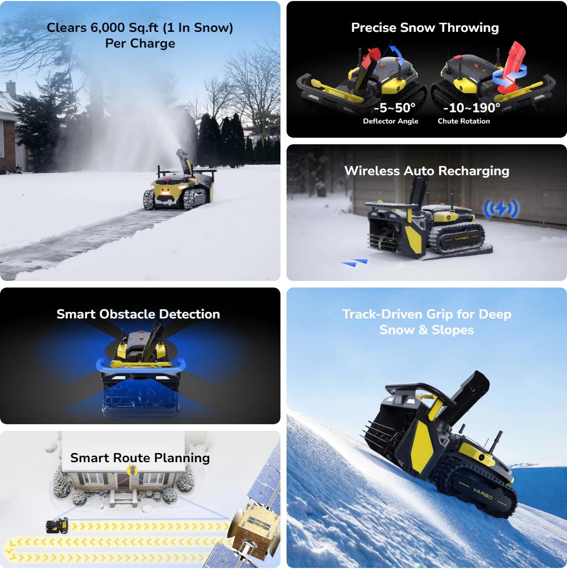A Yarbo hóeltakarító robot befogadóképessége nem alkalmas a követelményeket meghaladó hóvastagságra. A Yarbo azonban úgy van kialakítva, hogy azonnal működésbe lépjen, amikor elkezdi havazni, megakadályozva a túlzott hófelhalmozódást. A Yarbo dokkolóállomás használatával folyamatosan működhet, hogy a felhajtója vagy a kijelölt terület 24 órában, 365 napban hómentes legyen. A -25 °C a Yarbo standard működési hőmérséklete, elsősorban az akkumulátor korlátai miatt. A Yarbo azonban fűtőmodulokkal van felszerelve a főbb alkatrészeihez (beleértve az akkumulátort és a hajtásláncot), így akár -40 °C-os hőmérsékleten is működőképes.