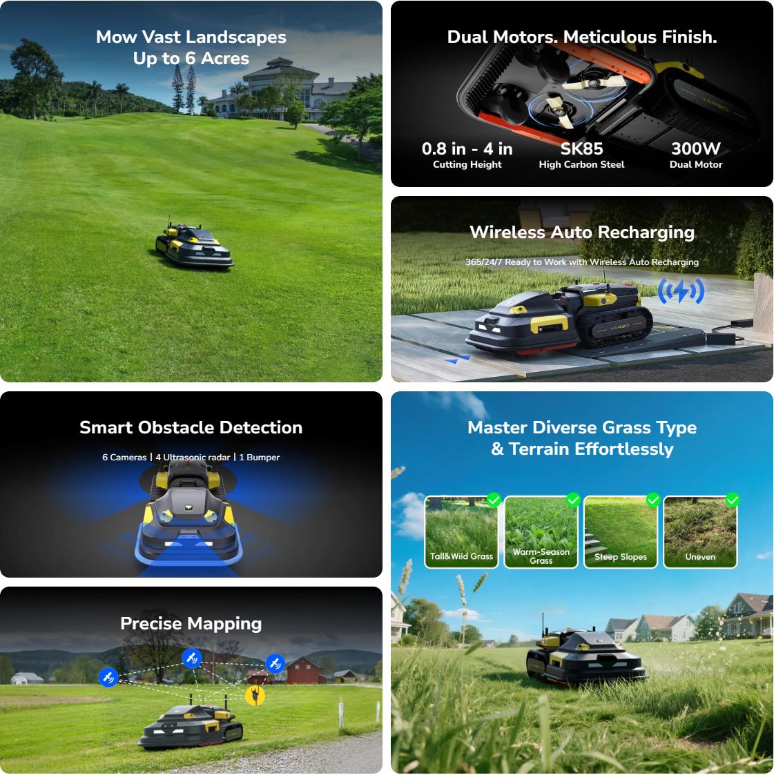 A Yarbo Lawn Mower Pro kettős 300 W-os motorokkal rendelkezik, amelyek 2500 W csúcsteljesítményt nyújtanak, új opcionális mulcsozó pengékkel és továbbfejlesztett vágási magasságtartománnyal, amely 0,8 hüvelykig (2 cm) terjed. Ezekkel a fejlesztésekkel a Yarbo Lawn Mower Pro kiválóan alkalmas lakossági gyepápolásra, és használata kiterjed a kereskedelmi alkalmazásokra is. Tökéletes hideg és meleg évszakú fűfajtákhoz, valamint nedves, sűrű és hosszú fűfajtákhoz egyaránt.